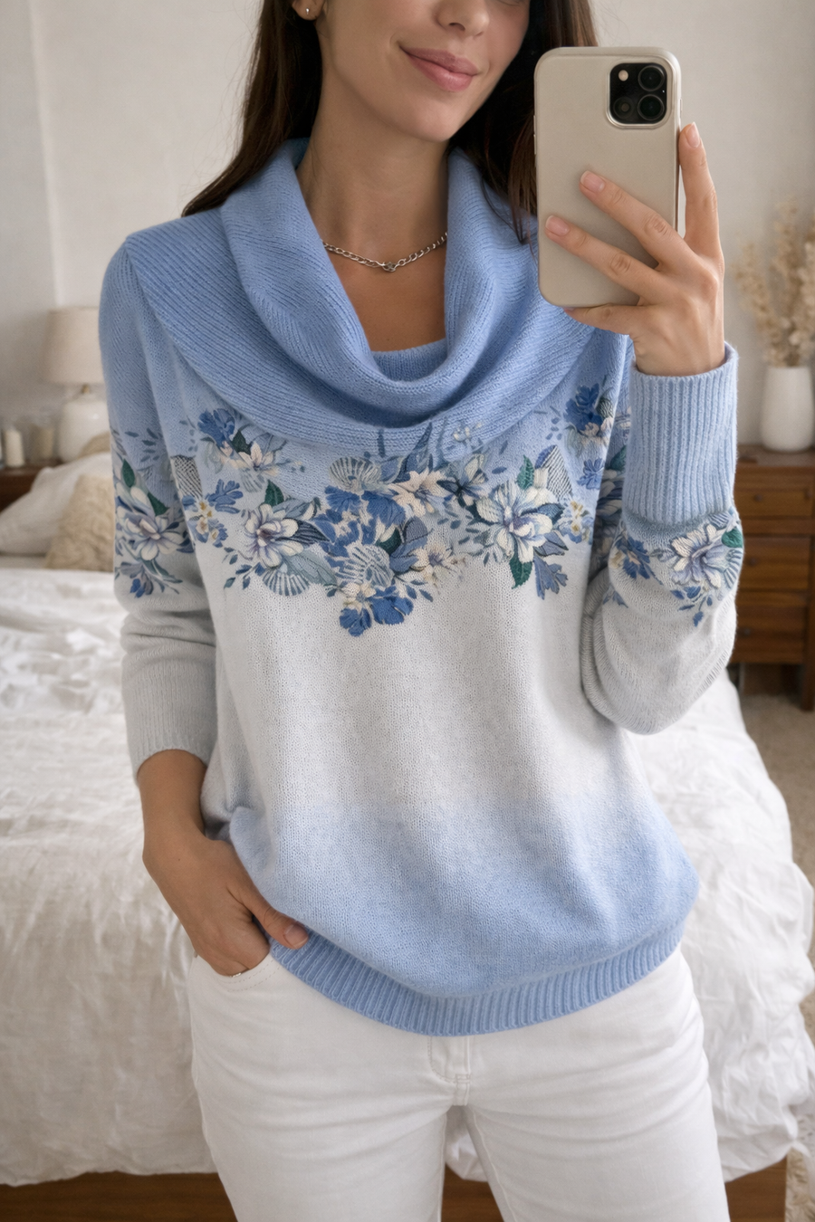 Bellissimo maglione, ancora più delicato dal vivo. Il colore azzurro è luminoso e i dettagli floreali sono molto eleganti. Veste bene ed è comodo da indossare tutto il giorno.